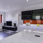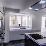 The different types of lighting in this kitchen help to set an atmospheric mood, from the handle trim lighting to the illuminated glass cupboards. The mix of glazed units have been used to break up the solid cabinetry, with black glass doors in the centre and electric glass ‘climbing’ units either side.