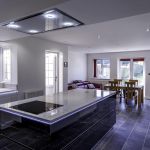 The quartz worktop in ‘Lyra’ has a subtle vein on a light background, which provides an attractive contrast on the island. Integrated into the island is the hob, with a flush ceiling extractor that doesn’t detract from the eye line.
