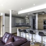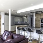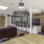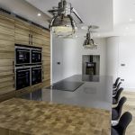 Following the metallic theme, the client has installed stunning pendant search lights over the island and dining table in a chrome finish.