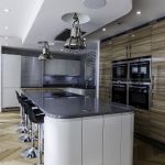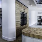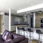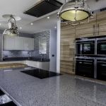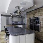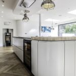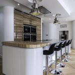 The client opted for white gloss ‘J’ trim units from our English range, combined with a wood effect gloss to blend with and compliment their parquet flooring. The worktop is a grey quartz in ‘Chrome’, which adds a subtle sparkle to the room and blends with the silver wall cladding in the sink area.