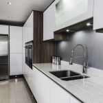 A backsplash of grey glass breaks up the white, as well as the feature wood side panels on the units.