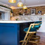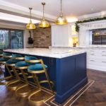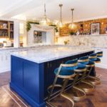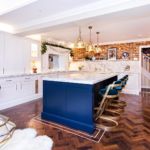 Old and new. This kitchen has the perfect balance. The period features consisting of the original brick wall and parquet floor. Paired up beautifully with the on trend fixtures and finishes in the gold and royal blue.