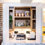 There has been clever use of hidden storage for example the dinner tray storage solution perfectly blending into the timeless shaker style kitchen in the same natural oak finish as the carcase. As well as a tea and coffee making station hidden behind the double bi-fold doors, this can be left open when in use and closed away when not.