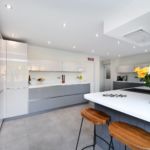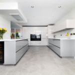 This high end kitchen has been created by using a mix of ‘AV2030 gloss taupe’ on the bank of wall and tall units while the base units have been finished in ‘AV2030 gloss pearl grey’. The door finishes have been beautifully compliments by the ‘Designer white Corian’ worktop with up stands.