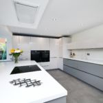 This kitchen is a balanced mix of both handless and handles which works well as it still achieves the desired sleek finish while being practical. The tall bank of units have been paired with our Mereway 720 handles, this is so as to help make it easier especially for younger children and older grandparents, to open the larger doors on the full size fridge and freezer because of the vacuum seal. The chosen handles do not distract from the rest of the kitchen or stick out as they sit within the lines of the door and drawer splits and, are stainless steel matching the handless trim. The base and wall units have been made handless which then create long continuous lines for your eyes to follow making the room feel even bigger.