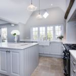 This traditional shaker style kitchen has been created by using ‘Gainsborough pale grey’ with quartz worktop and upstand in the ‘Alaska’.